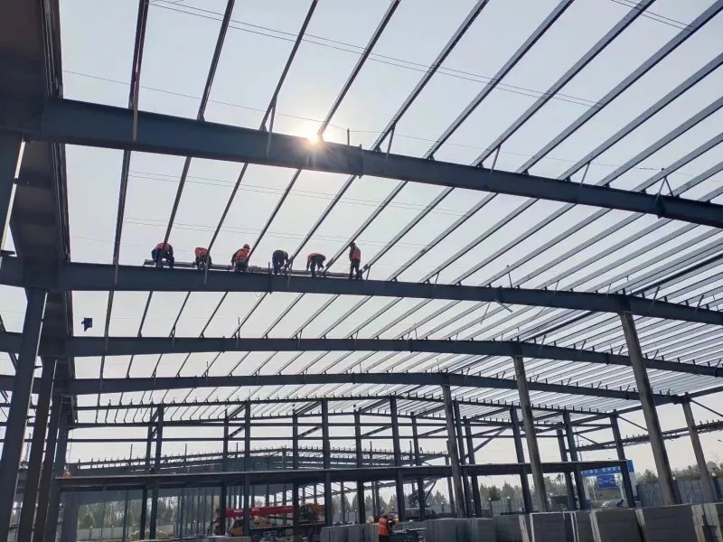 መልስ-ፖርታል አረብ ብረት አሠራሮች መጋዘኖች በተለምዶ በፋብሪካ ውስጥ የታሸጉ ናቸው ከዚያም ወደ የመሰብሰቢያ ቦታው ይላካሉ. የግንባታ ሂደቱ የአረብ ብረት አምዶችን, ጨረሮችን እና የጣራ ጣውላዎችን በመሠረት ላይ ማካሄድን ያካትታል, የግድግዳ ፓነሎች እና ጣሪያ መጫን ተከትሎ ይከተላል.