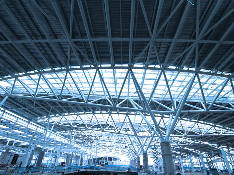 5. የጣሪያ እና የውጭ ሽፋን የአረብ ብረት ክፈፉ ከተጠናቀቀ, የጣሪያው ስርዓት ይጫናል, በተለይም የተከለለ የብረት ፓነሎች ወይም ነጠላ ሽፋን ቁሳቁሶችን ይጠቀማል. ውጫዊ ግድግዳዎች, በንድፍ ውስጥ ከተካተቱ, የብረት ፓነሎች, ጡቦች ወይም ሌሎች ማቀፊያ ቁሳቁሶችን በመጠቀም ይጫናሉ.