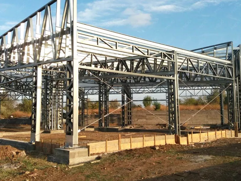 4. የአረብ ብረት መዋቅር መትከል በቅድሚያ የተሰሩ የብረት እቃዎች ወደ ግንባታ ቦታው በማጓጓዝ ክሬን እና ሌሎች ከባድ መሳሪያዎችን በመጠቀም ይሰበሰባሉ. የመጫን ሂደቱ የሚጀምረው ዓምዶቹን በመሠረት ላይ በማቆም እና በመገጣጠም ነው, በመቀጠልም የመጋዘን ፍሬም ለመፍጠር ምሰሶዎችን መትከል. ከዚያም የጣራውን መሸፈኛዎች የጣራውን ስርዓት ለመደገፍ ይጠበቃሉ.